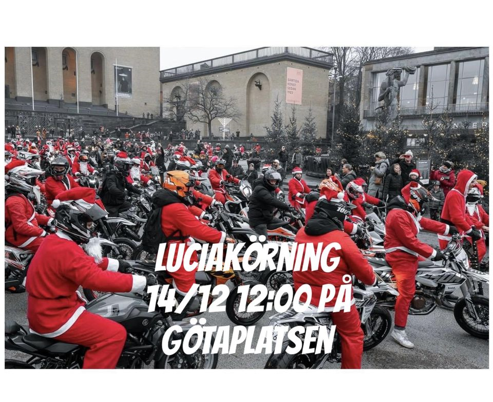 Beroende på väderleken kan även söndagen 15de vara aktuell men beslut tas närmare dagen. All info kommer att skrivas ut i detta evenemanget, så se till att ni har tryckt i ”intresserad eller kommer” så ni får notis och info om dagen skulle ändras! Alla typer av motorcyklar / mopeder / el-scooter är välkomna att åka med på Lucia körningen, det blir i ett gång tempo runt om i Göteborg för att sprida lite julglädje åt folket!