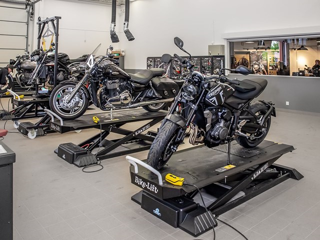 -Vi på Triumph Stockholm Norr har lång erfarenhet av att jobba med premium-segmentet och är både stolta och förväntansfulla inför förtroendet vi fått, säger Adi Ravid, VD för DSMO-Gruppen AB, som Triumph Stockholm Norr nu är en del av. Nu står ett nytt team redo att ta emot Triumphs kunder i helt nyrenoverade och ombyggda lokaler på Karins väg 5 i Upplands Väsby. Här finns nu en fantastisk anläggning som präglas av premiumkänsla med ett stort showroom och en toppmodern auktoriserad verkstad med märkesutbildad personal som alla brinner för T...riumph. På övervåningen byggs en tilltagen loungeyta där våra kunder snart kan ta en kopp kaffe och slappna av, sitta ner och jobba, eller blicka ut över verkstadsgolvet där motorcykeln tas om hand.