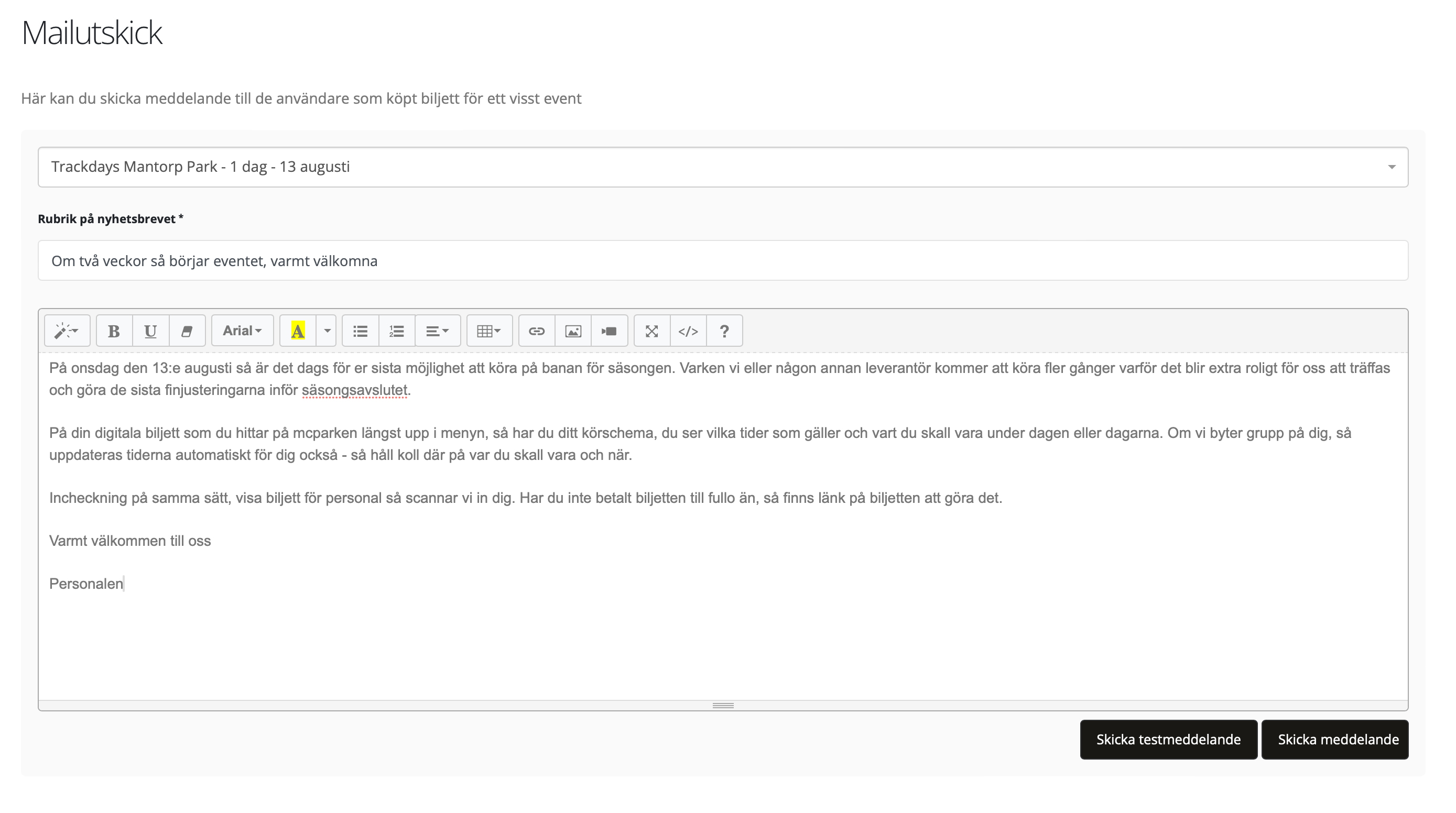 För att enkelt och smidigt skicka meddelande via epost så kan du välja det eller de biljett-typer som du vill skicka till. Du kan bara välja en biljett åt gången (så spara undan texten och klistra in i ett nytt meddelande) om du skall skicka till flera grupper samtidigt. Detta meddelande kan innehålla både text, länkar och bilder till kunden.