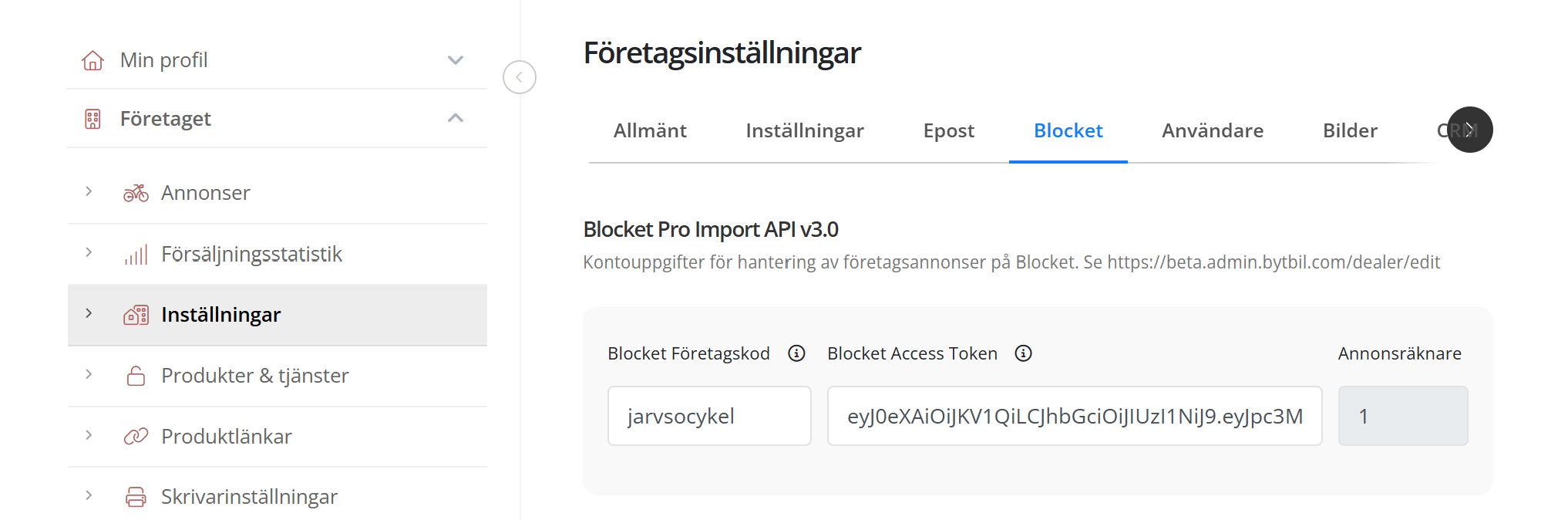 Du har två fält att fylla i. Blocket kallar det första fältet för lite olika namn, i mailet ovan nämns det som Endpoint, ett annat ord som nämns och kan ses på beta.bytbil.. är Företagskod.