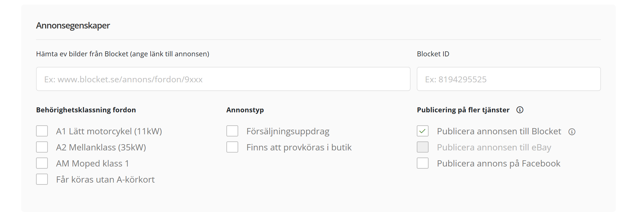 Nu när dessa inställningar är klara, så har ni aktiverat tjänsten att kunna administrera era annonser via mcparken. Detta kan ni se när ni adderar annonser och har tillgång till en checkbox som heter "Publicera annonsen på Blocket".