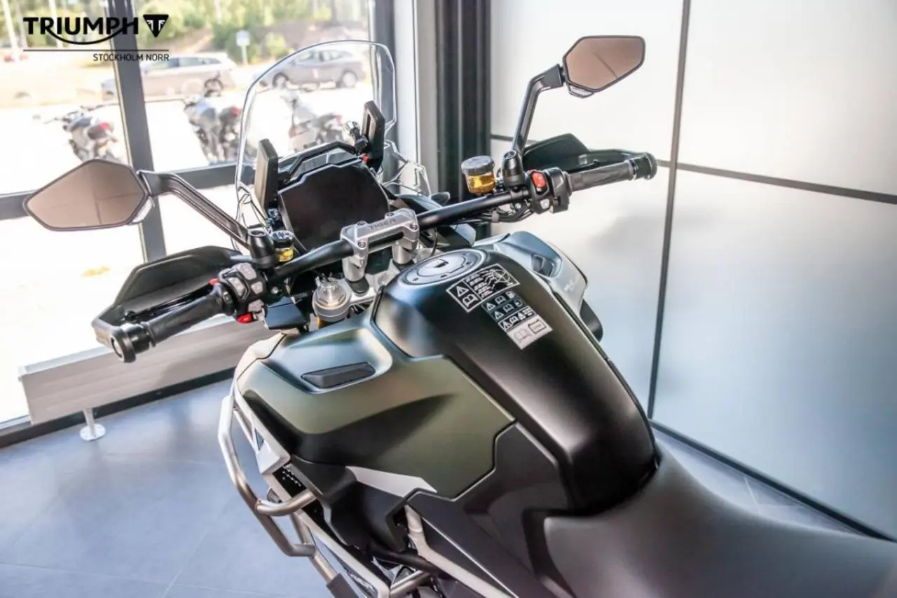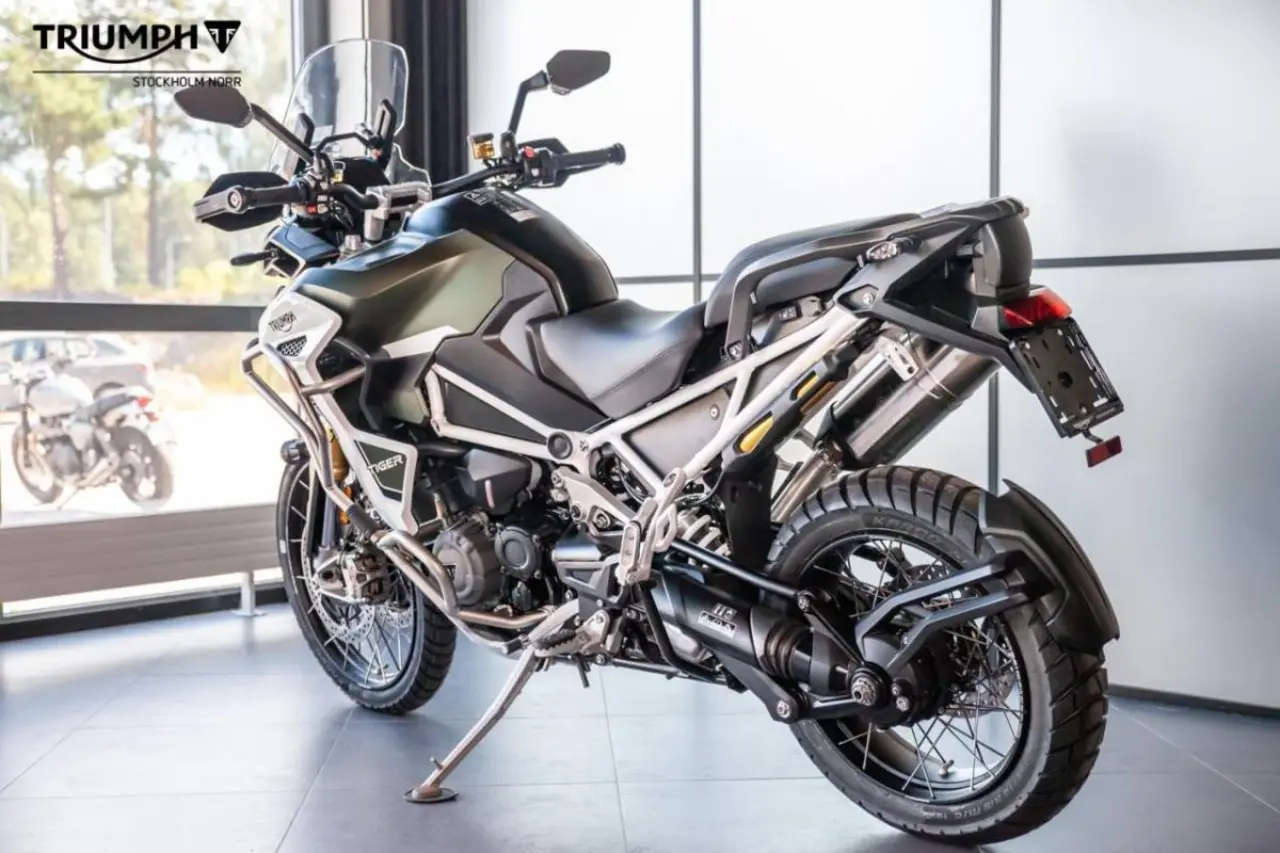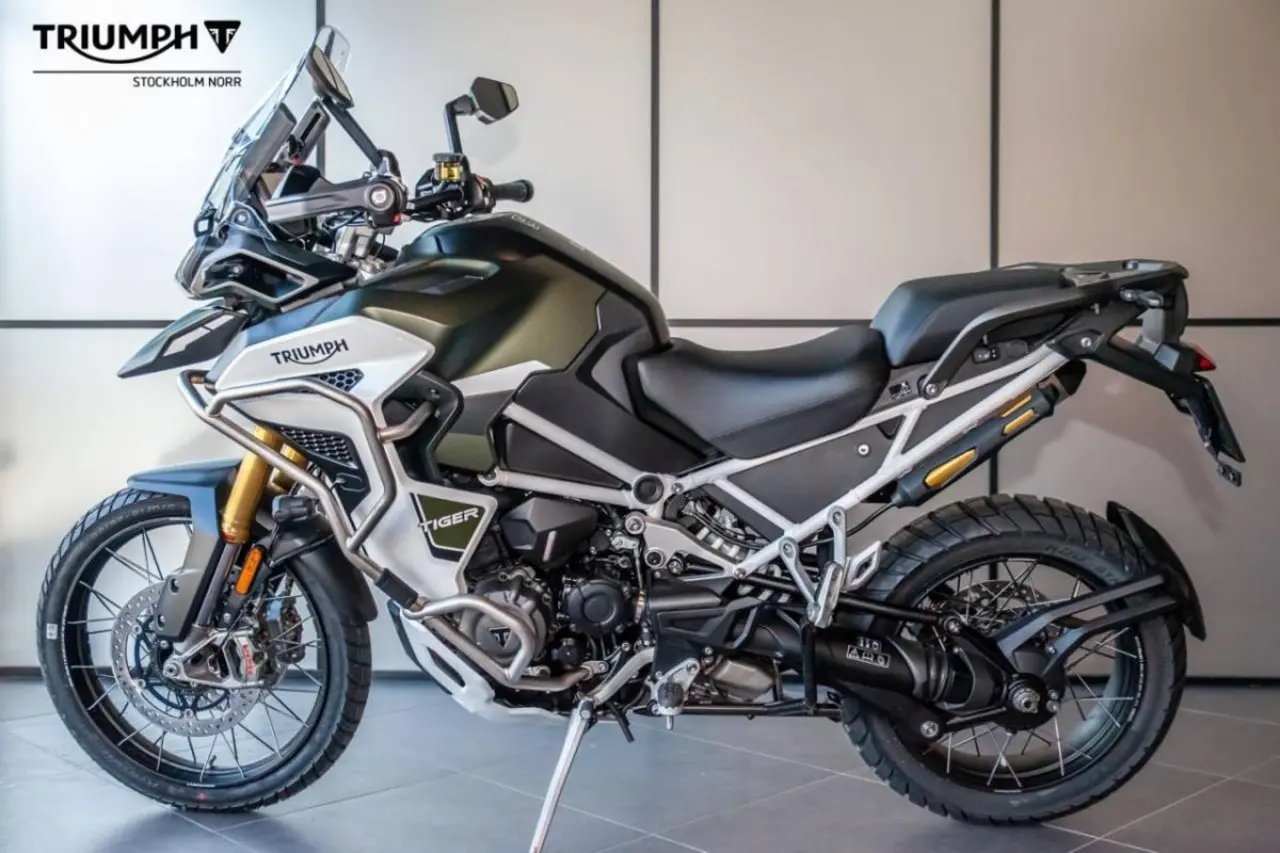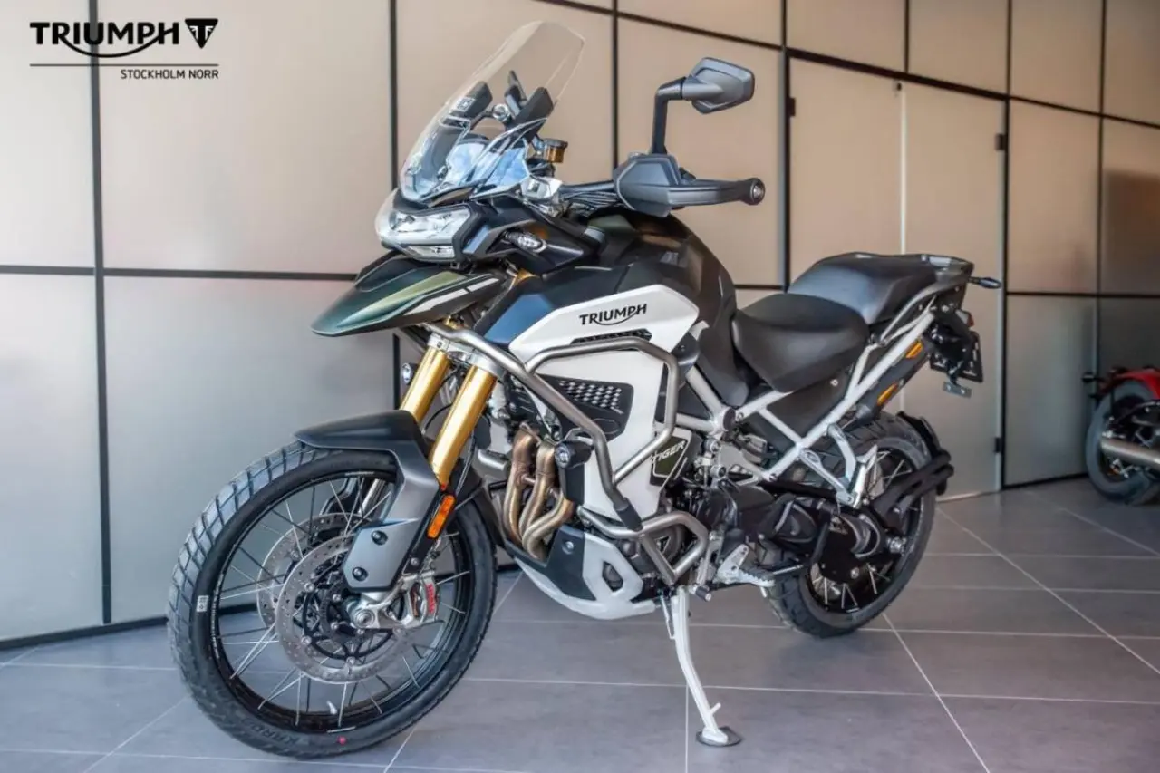 Detta är Tiger 1200 Rally Explorer, Triumphs flaggskeppsmodell i äventyrssegmentet. Rally-modellen är lämpad för landsväg men är även kapabel off road med sin 21 tums slanglösa ekerfälg fram och 18 tums dito bak.