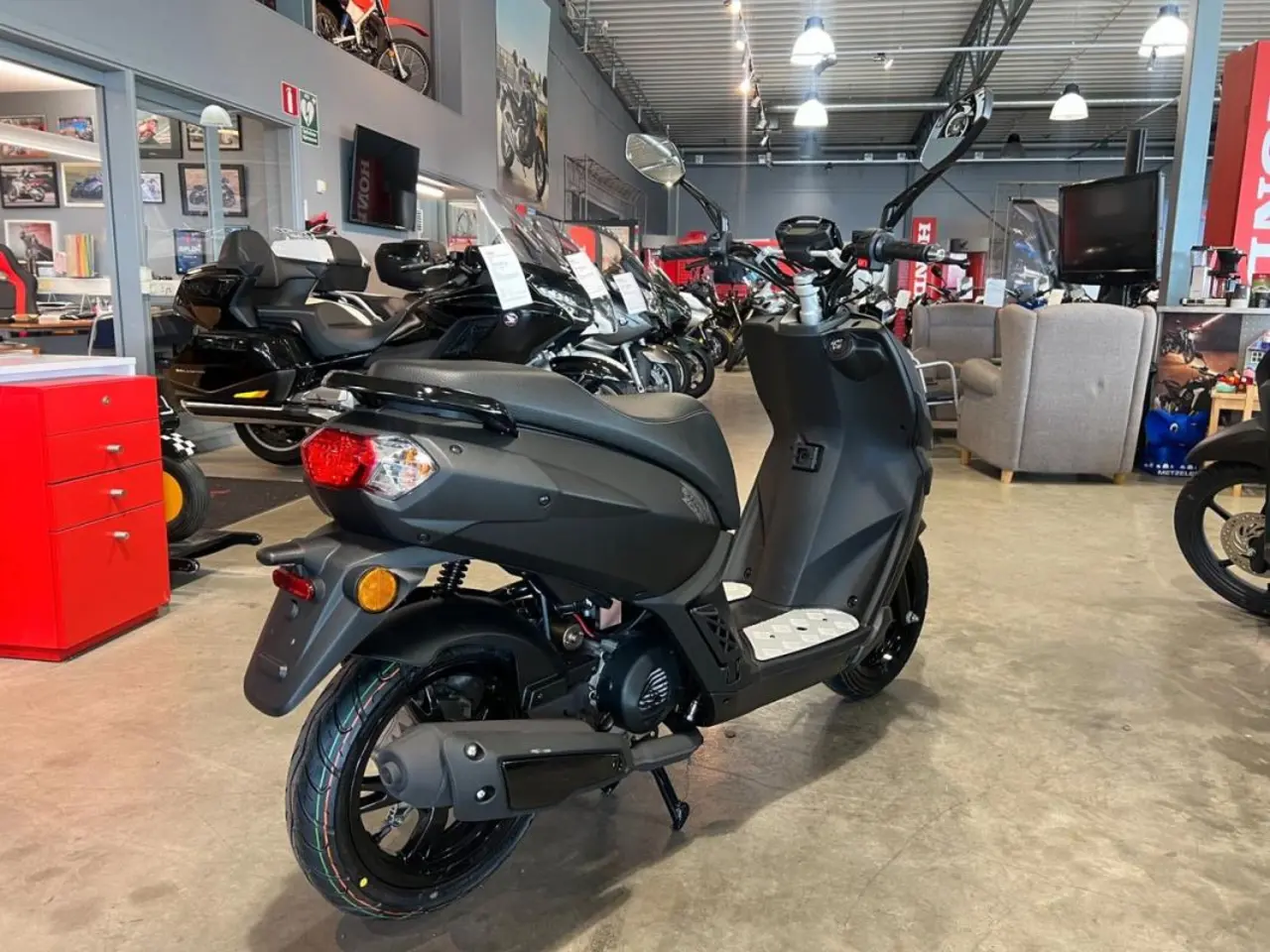 Med ett praktiskt förvaringsfack under sadeln kan du kan lagra dina saker på ett säkert sätt. Plant golv för bättre fotgrepp med infällbara skjutspinnar och komfort samt Waveskiva fram.