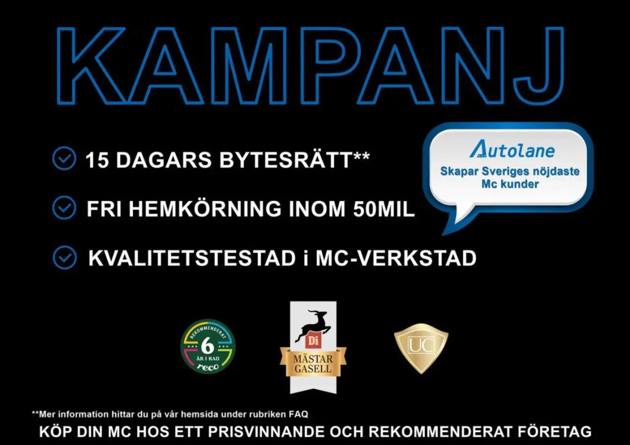 Vi ERBJUDER även VIDEOSAMTAL så att du kan se fordonet LIVE i mer detalj. Hör av dig för mer info samt eventuellt leveransdatum hem till dig. Finansiering löser vi snabbt, smidigt... och enkelt då vi samarbetar med de flesta förekommande banker på marknaden. Vi kan erbjuda garantier på ditt fordon upp till 30 månader! VI TAR BÅDE BIL OCH MC SOM INBYTE. Alla våra fordon har genomgått ett noggrant kvalitetstest i vår fullserviceanläggning. Transport från 3000kr. En administrationsavgift på 1495:- tillkommer på alla våra fordon. All info och fler bilder ser du på https://www.autolane.se eller kolla upp oss på Facebook och se vad våra kunder tycker om oss. Varmt välkomna! Autolane, AM