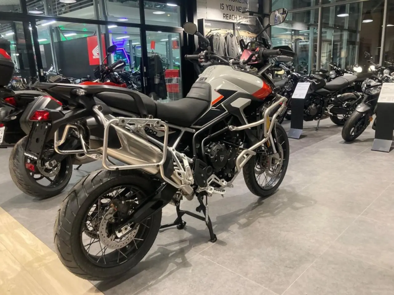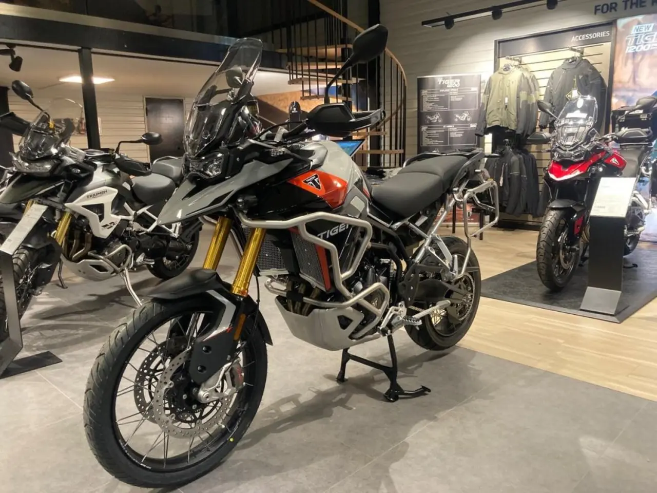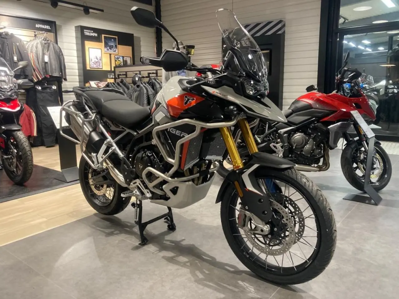 Nu säljer vi demon av Triumph 900 Rally Pro i färgen Ash Grey Intense Orange 57mil. (Mc på bild extrautrustad