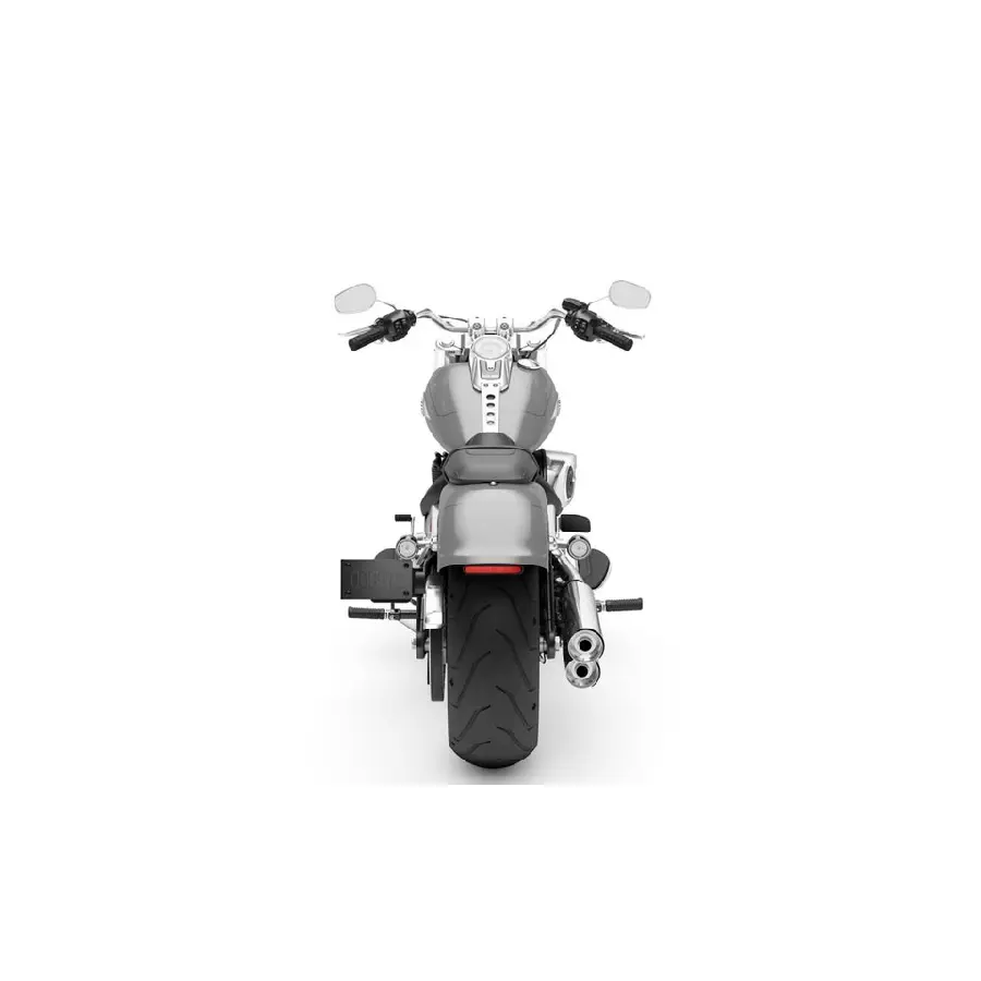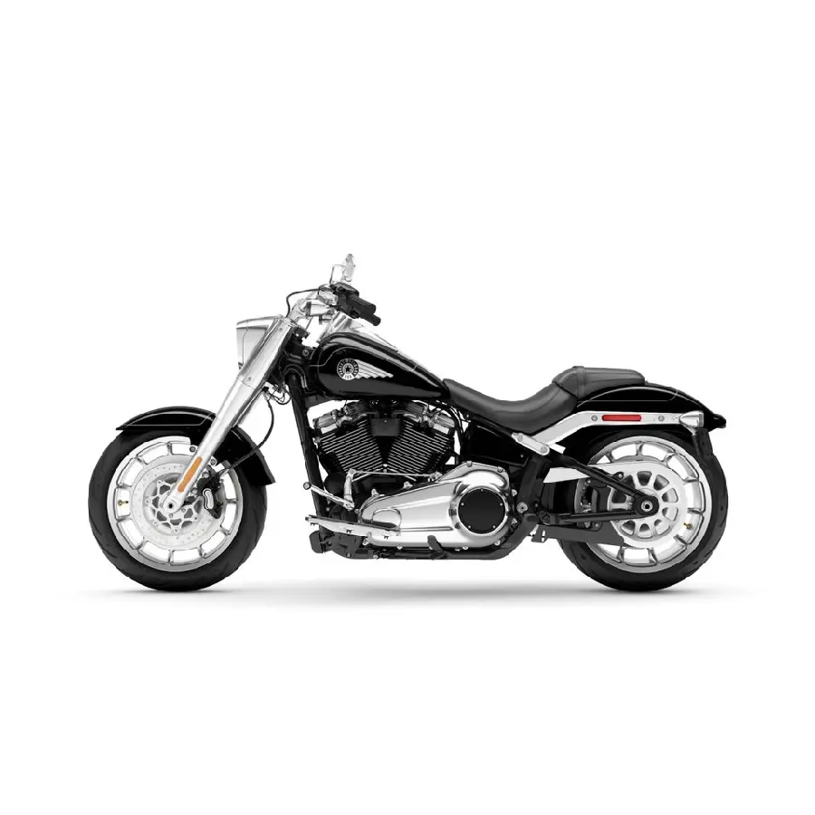 De maskinbearbetade 457 mm Lakester-fälgarna med massiva däck, täckta av cutback-stänkskärmar, ger en kraftfull och dominerande närvaro. Fat Boy-strålkastarhuset, framhäver det stora och muskulösa utseendet på frampartiet, vilket ger ett imponerande intryck både på vägen och när den står still.