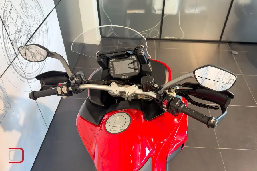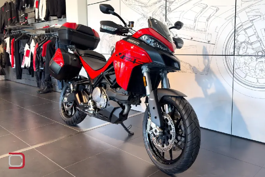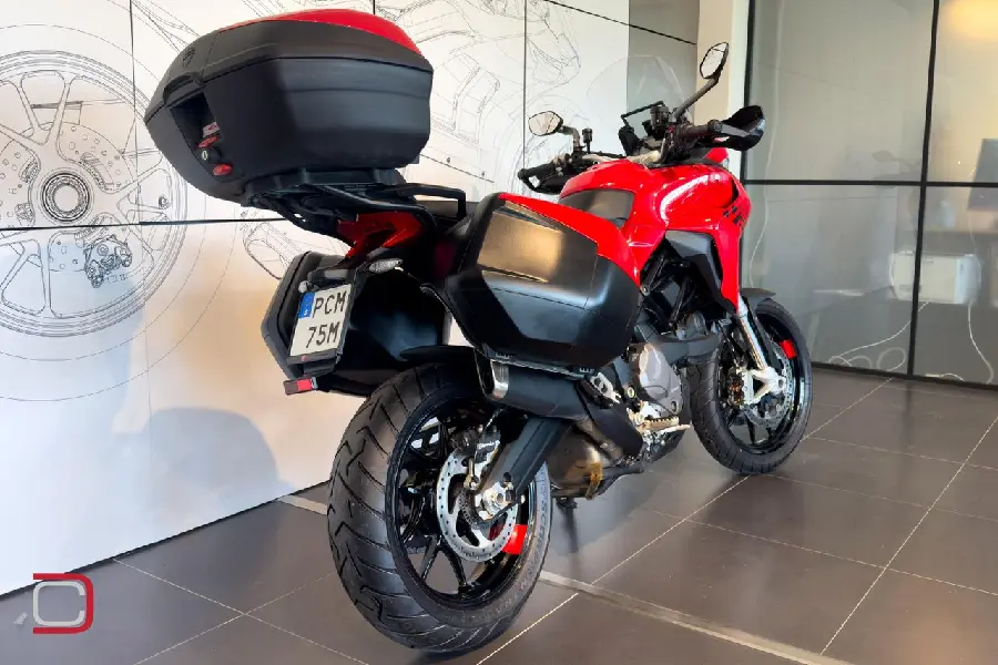 PCM75M Multistrada V2S utrustad med både sidoväskor, top box och handtagsvärmare samt centralstöd.