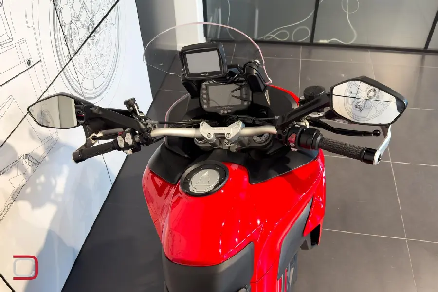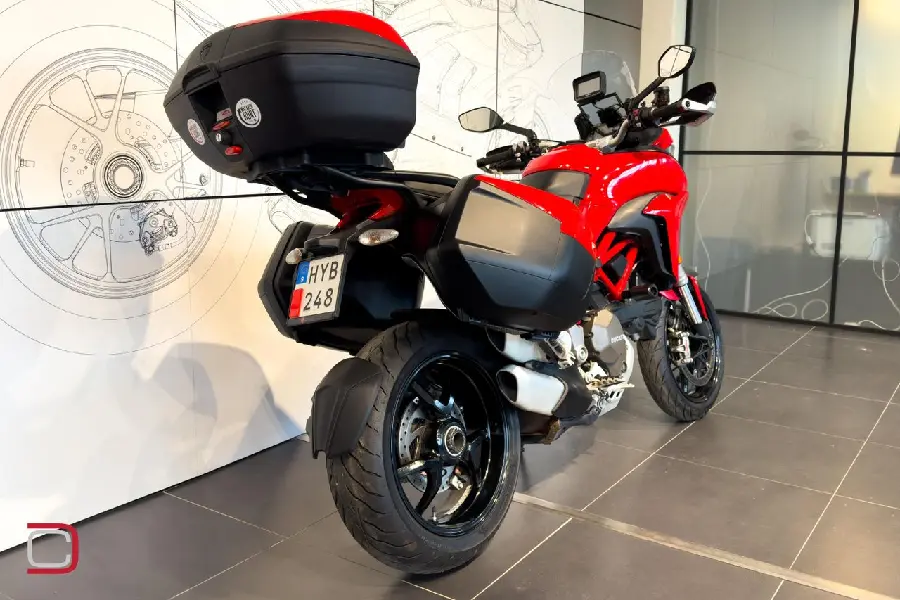 Ducati Multistrada 1200 S utrustad med sidoväskor, topbox med ryggstöd, handguards, hasplåt, centralstöd och tankväska (syns ej på bild).