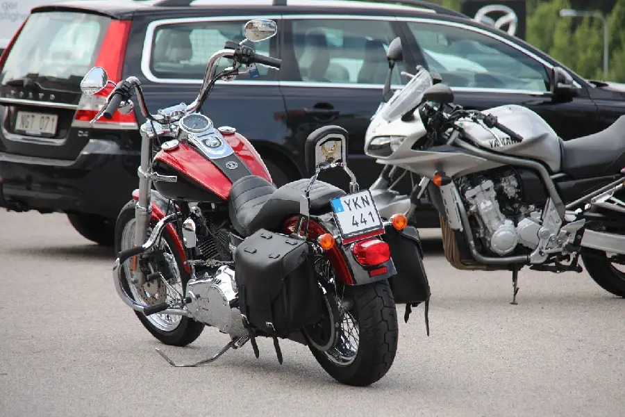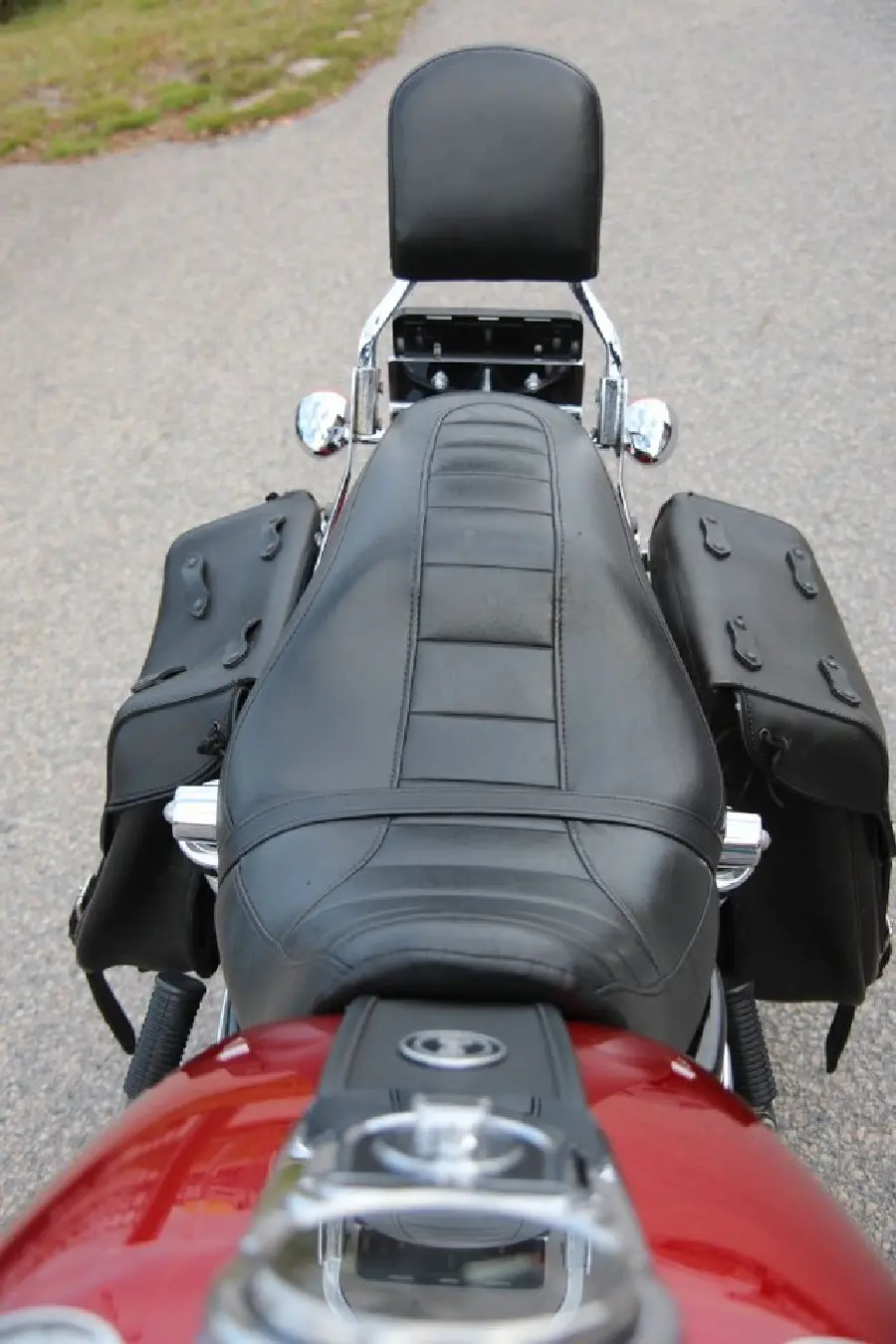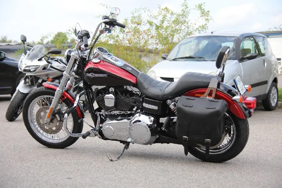 Detta ex i den snygga tvåtonslacken i rött och svart glänser alldeles lagom smakfullt med sin mjuka mix av krom, lack och mattsvarta detaljer. De två Lejonkula-väskorna i läder förhöjer... dessutom looken ytterligare tillsammans med H-D:s sissybar, motorbåge Vance & Hines avgassystem och lite sköna kromdetaljer som pricken över i.